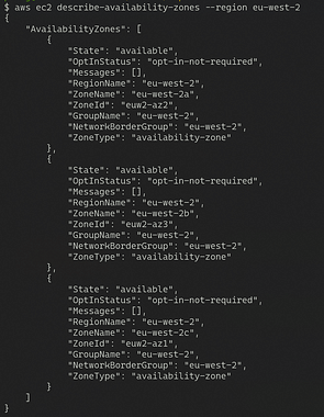 The command below will show only the availability zones for the user’s default Region (as specified in aws…